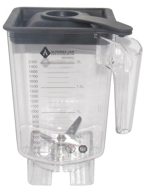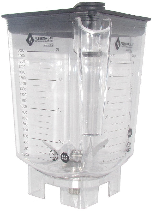 inches tall (22,50 cm). Weight including blade assembly and bottom plate 2.5 lbs (1,1 Kg). Tamper is included in this price. Material is BPA-FREE Co-Polyester by Eastman Tritan. Lid fits on Blendtec(R) jars, and Blendtec lids fit on the Alterna Jar(TM). Removable rubber lid cap -semi-permanently attached to lid, for inserting ingredients during blending; does not fall off unless removed; store on lid. Blade assembly 4 knives sharpened - blade turns counter - clockwise, stainless steel housing with carbide ball bearings;